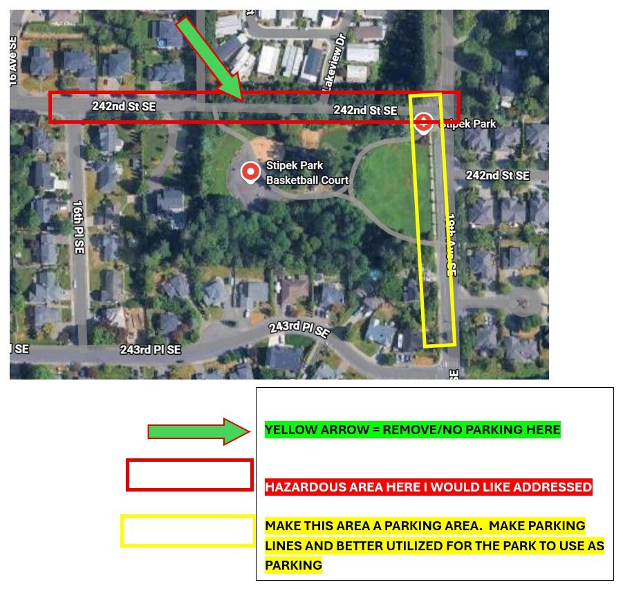 You will see in the picture that I have attached the area that is in the box that I feel needs to be addressed. I feel that the area with the arrow directly above it should have no parking allowed on that side of the street, thus removing the need for parents or children to cross the street to access the park.